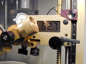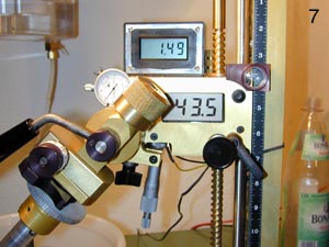 Mounting the micrometer and steel plate are straightforward. Make sure that the wiring does not interfere with the motion of the faceting head. I already had an inexpensive ($8) voltmeter module with an AC adapter and a housing large enough to accomodate the circuitry and a battery for the voltage reference. Figure 7 shows the complete modification with micrometer head and depth-of cut indicator. This arrangement has increased my enjoyment of faceting - no more accidental angle changes - and I believe it has improved the quality of my work. Let me know if you find this modification useful. |